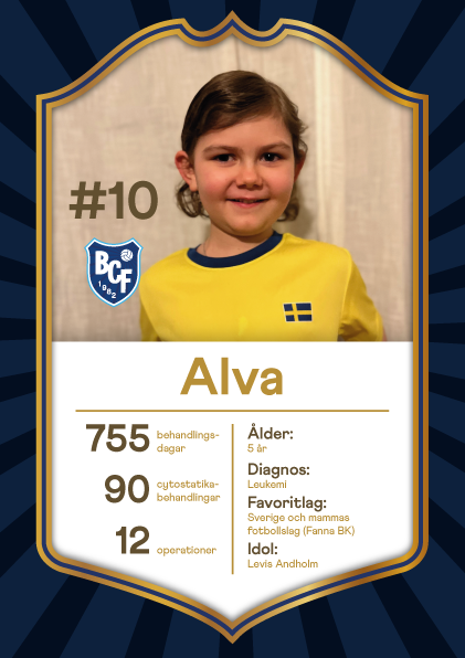 Alva, 5 år, leukemi. Alva älskar att röra på sig tillsammans med lagkompisarna och få känna sig som ett friskt barn för en liten stund. Favoritlagen är Sverige och mammas lag Fanna BK. Favoritspelare är mittfältskompisen Levis!