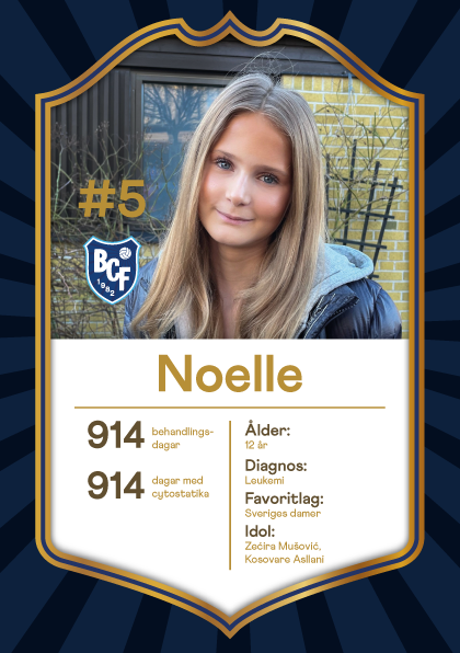 Noelle, 12 år, har gått igenom en 2,5 år lång behandling för leukemi. Noelle är en aktiv tjej som älskar handboll, dans och cirkus. Och så fotboll, där favoritlaget är Sveriges damer och där favoritspelarna är Kosovare Asllani och Zećira Mušović.