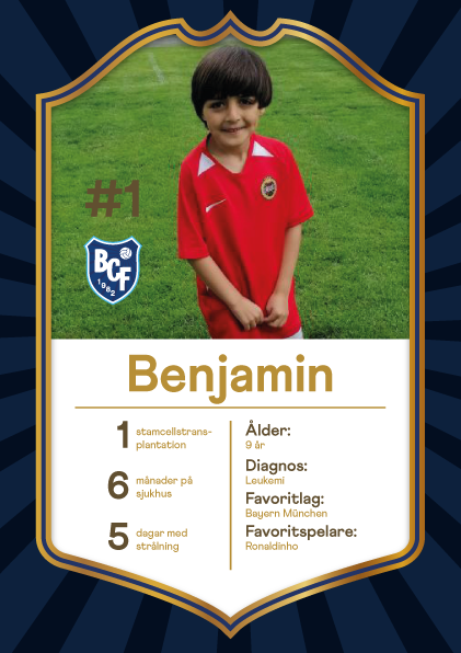 Benjamin, 8 år, är målvakt i BCF och har behandlats för leukemi. Fotboll betyder allt för Benjamin, som vill bli fotbollsspelare och som håller på Bayern München. Favoritspelare? Ronaldinho såklart.