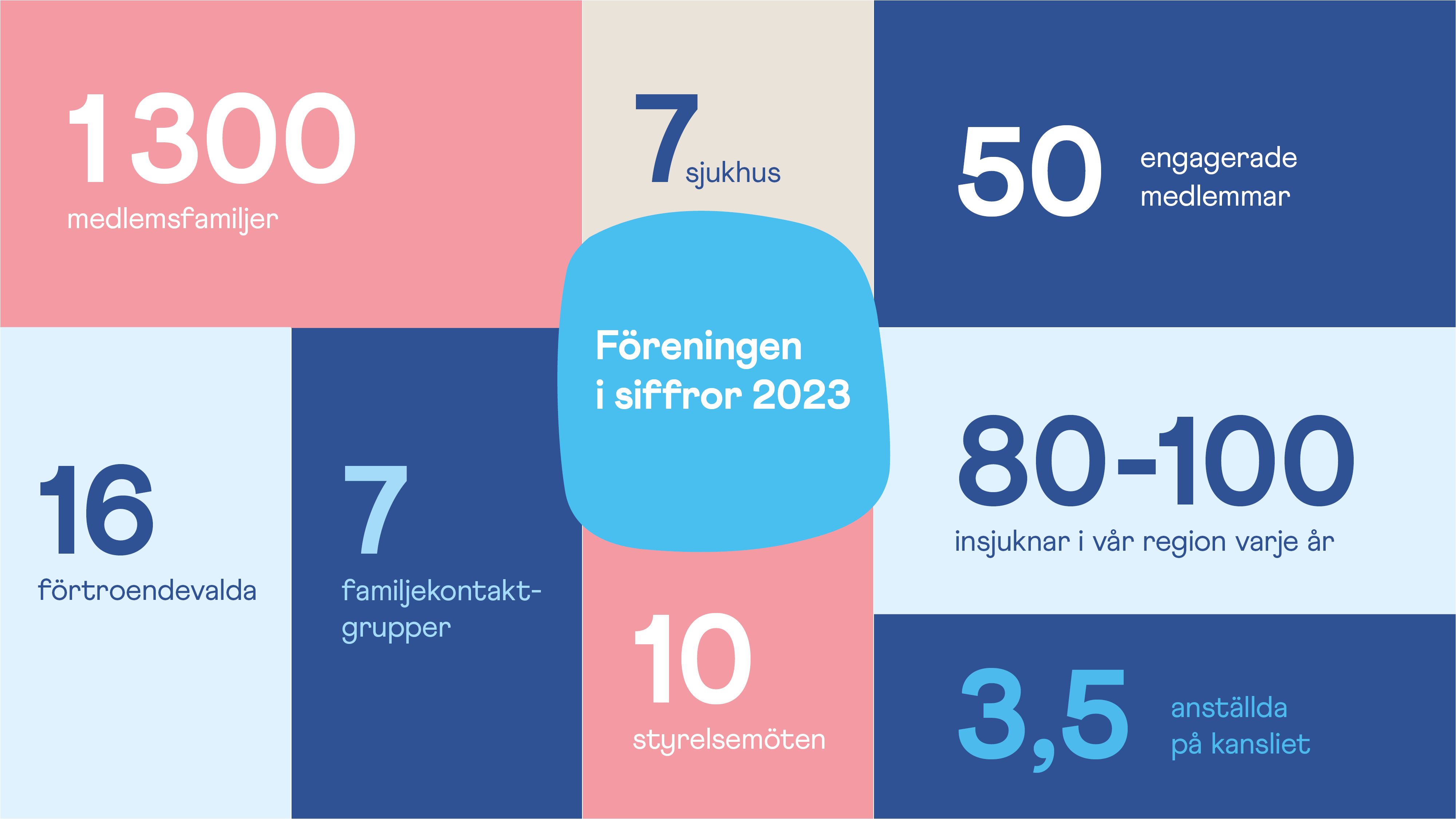 Några aktiviteter och vistelser som lyftes från föregående år var de femtio träffar som hölls för totalt 1300 barn och vuxna, de fyra mamma- och pappahelgerna som anordnats i Varberg, de ungdoms- och syskonträffar som arrangerats på Boda borg, Vi-som-mist-helgerna på Bokenäs samt insamlingsaktiviteter som Rock i Hjo och Hjulafton. Och när Erika presenterade nyckeltalen för 2023, var de såväl ekonomiska som exempel på vårt stöd till barncancerdrabbade familjer och Barncancercentrum.