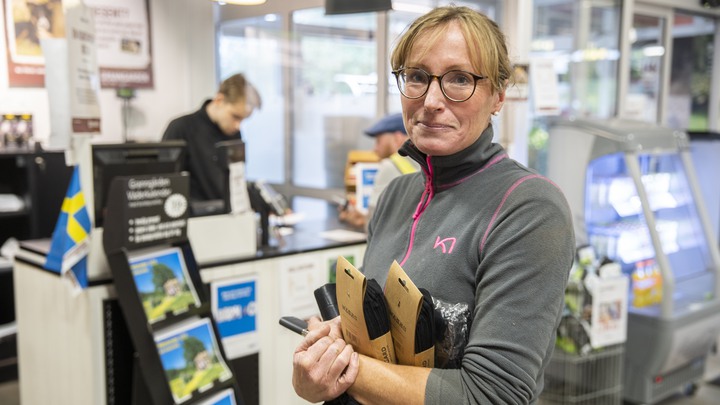– Nu har jag gjort dagens goda gärning och du har hjälpt mig, säger hon till Elias Daniels bakom kassan.